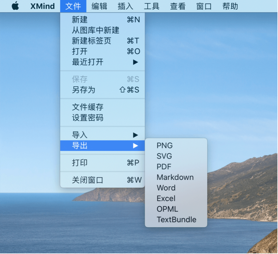 格式多样的导出功能,能满足各种用户的不同需求,目前思维导图支持导出成 PNG、PDF 格式,同时还能一键导出所有画布。