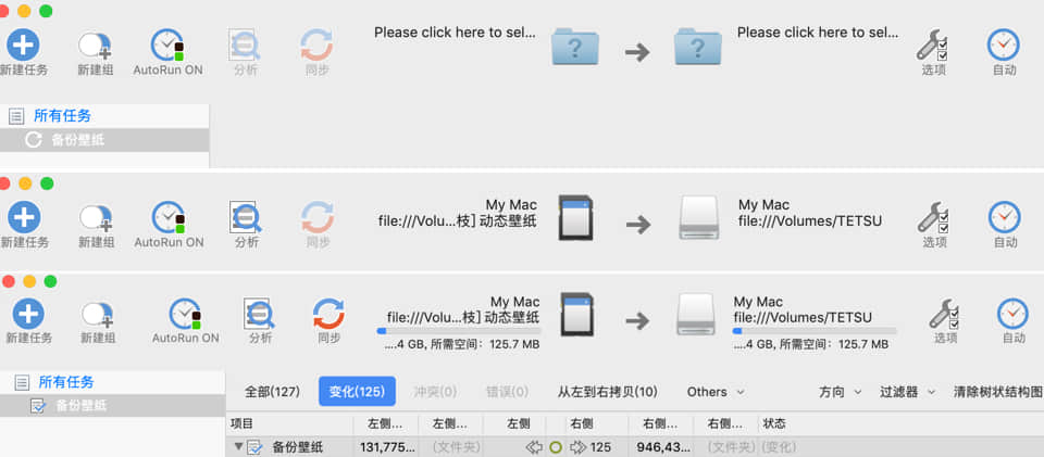 这样说可能有些绕,西米软件用前两天收藏的动态壁纸举例,先放进 U 盘备份,选定左边的源文件目录和右边的目标文件目录就可以了。
