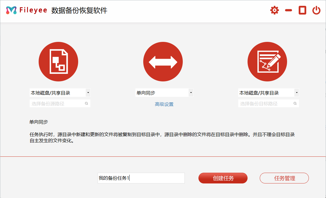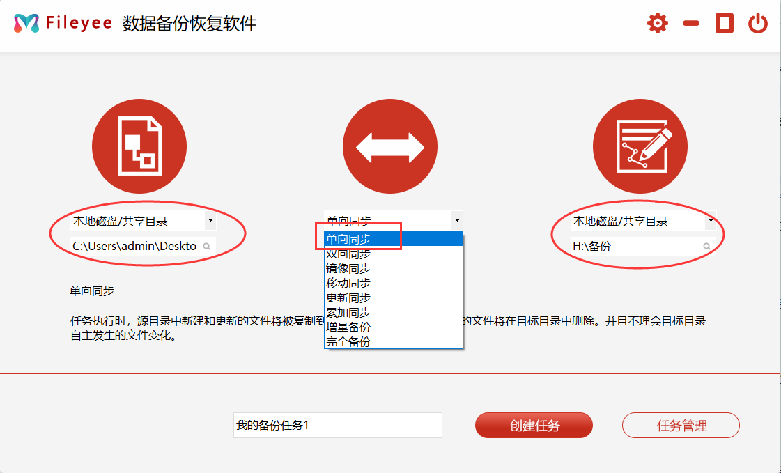 步骤2,如下图所示对软件进行配置,左边设置备份源,选择电脑中需要进行备份的文件夹;中间选择适合自己需求的文件同步方式,我这里选择“单向同步”;右边设置备份目标,选择移动硬盘中备份的位置。