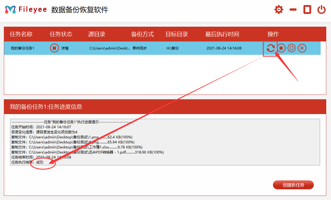创建好任务后软件会自动跳到备份任务管理页面,点击备份任务名称右边的“开始”图标按钮,启动备份,等备份结果为“成功”时说明备份完成。