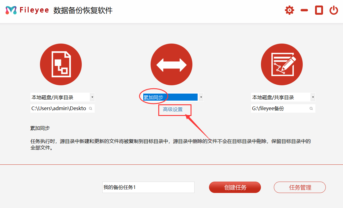 步骤2,然后在中间数据同步方式选择“累加同步”,再点击下方的“高级设置”按钮,设置自动备份以及其他参数,如果不设置会默认一个小时自动备份一次。