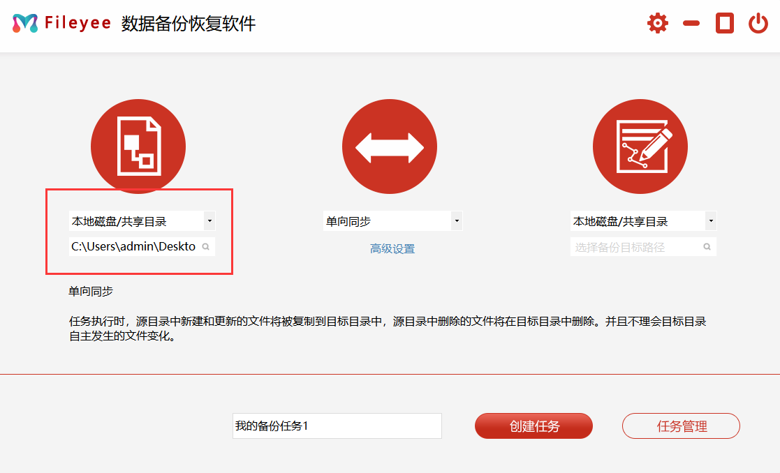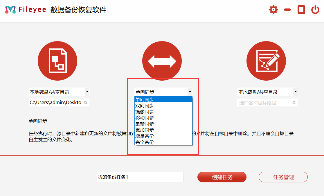 步骤2,选择备份数据传输的方式 您只需要将电脑上的重要数据单独传输到移动硬盘中,可以直接选择“单向同步”,还有其他的同步方式,如:双向同步、镜像同步、移动同步、更新同步等。