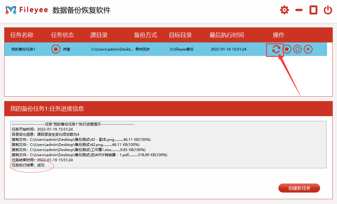 步骤4,任务新建完成之后,在没有其他设置需求的前提之下,可以直接进入到“任务管理”的界面,并点击“开始备份”图标按钮,即可实现电脑上重要数据的备份需求了。