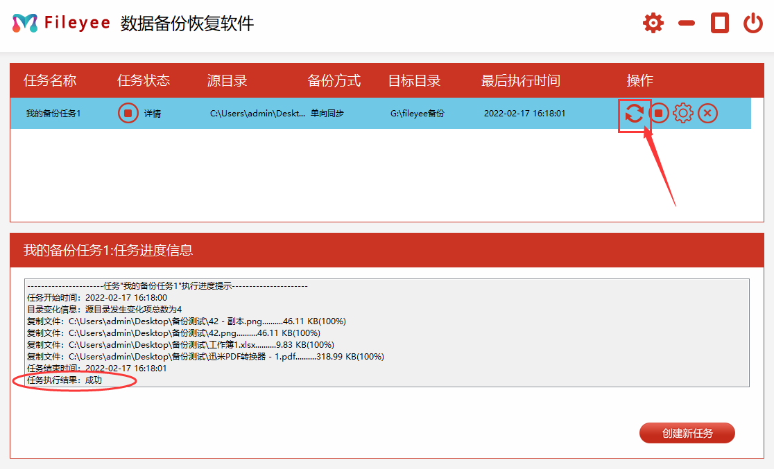 最后,点击备份任务右边的【开始】图标按钮,启动备份任务,稍等一会,当下面提示“执行结果:成功”的时候,说明备份完成。之后软件就会按照上一步设置的参数定时自动开启备份,无需手动操作了。