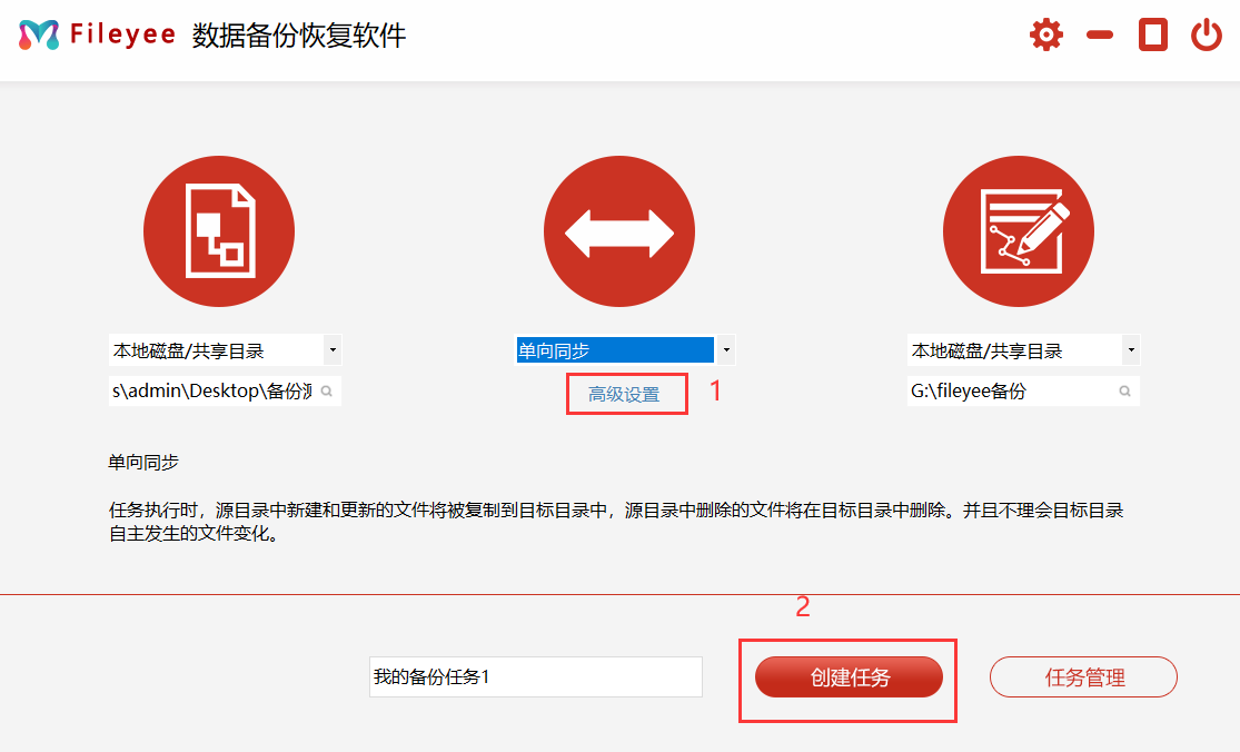 首先,先在电脑上下载“FileYee数据备份恢复”软件工具,再安装打开使用,我们需要做的是新建一个自动备份的任务。首先,选择数据所在的位置,也就是点击勾选框中文件所在位置选项。然后,选择文件传输的方式。目前,Disksync有多种方式,包括:单向同步、双向同步、增量同步、镜像同步、移动同步等等。简单一点的备份,可以直接勾选“单向备份”。接着,选择文件保存的目录。