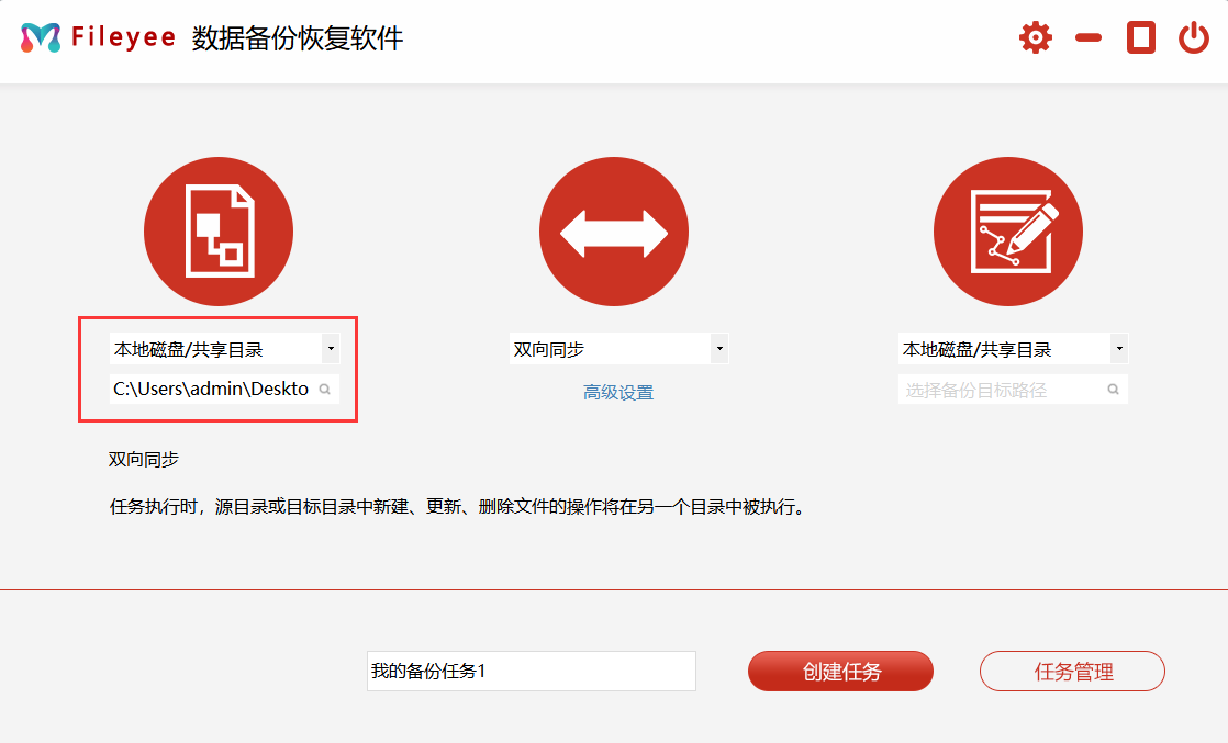 步骤2,随后选择文件同步方式,软件支持的同步方式有:单向同步、双向同步、增量同步、镜像同步、移动同步等,根据需求选择适合你的即可。如果想要实现自动备份,就需要点击下面的高级设置进行相关的参数设置。