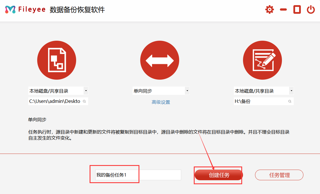 步骤3,输入框内输入备份任务名称,主要是为了方便你区分。然后点击右边的“创建任务”红色按钮,任务创建成功后会软件会自动跳转到任务管理页面。