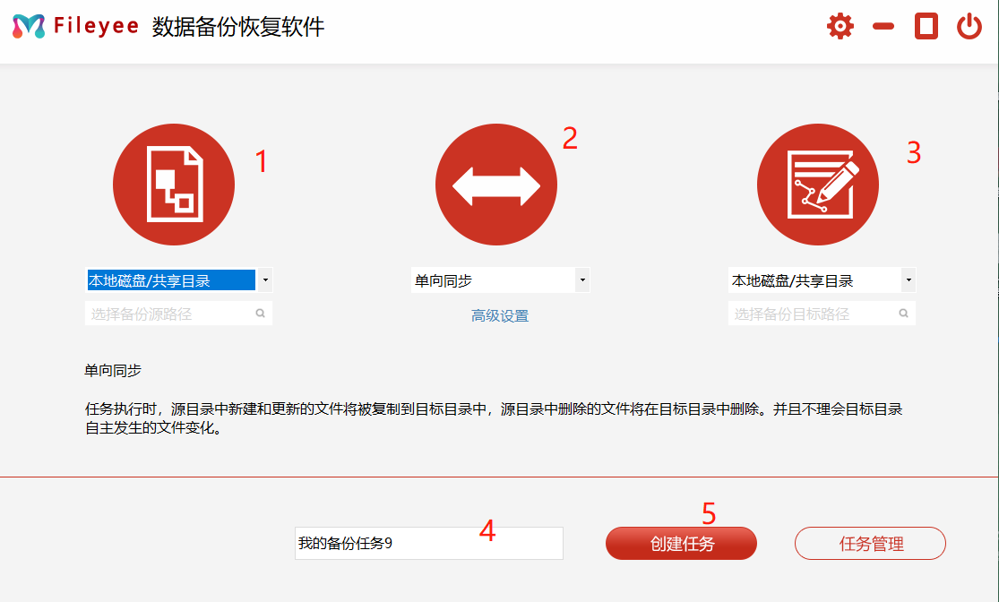 首先大家需要下载FileYee,然后选择文件所在文件,设置成文件的备份源路径,同步方式根据自己实际需求选择即可,一般建议选择单向同步,因为你是直接将文件同步至目标文件。