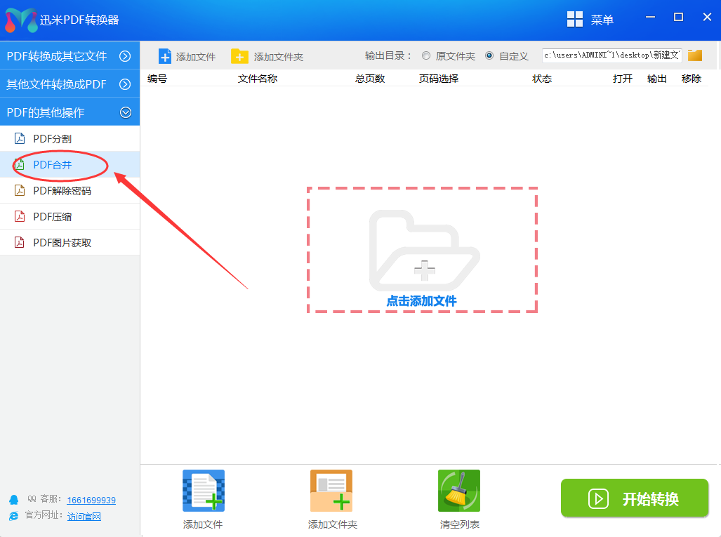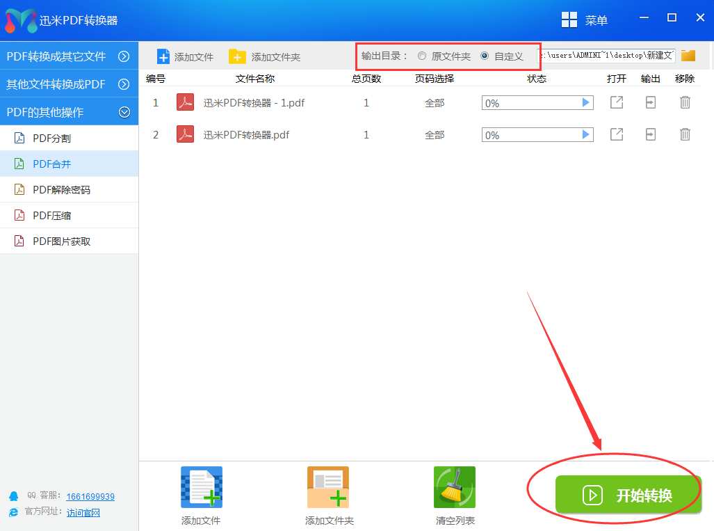 第四步、软件上方有“输出目录”的单选项,什么是输出目录?就是合并后PDF文件的保存位置,你可以选择源文件夹,也可以自定义位置进行保存。然后点击下方的“开始转换”开启合并操作。