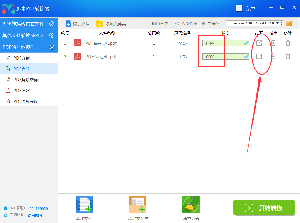 第五步、当每个PDF文件的换进度状态栏变成100%的时候,说明PDF文件合并成功了,点击右侧打开按钮就可以打开合并后的新PDF文件。