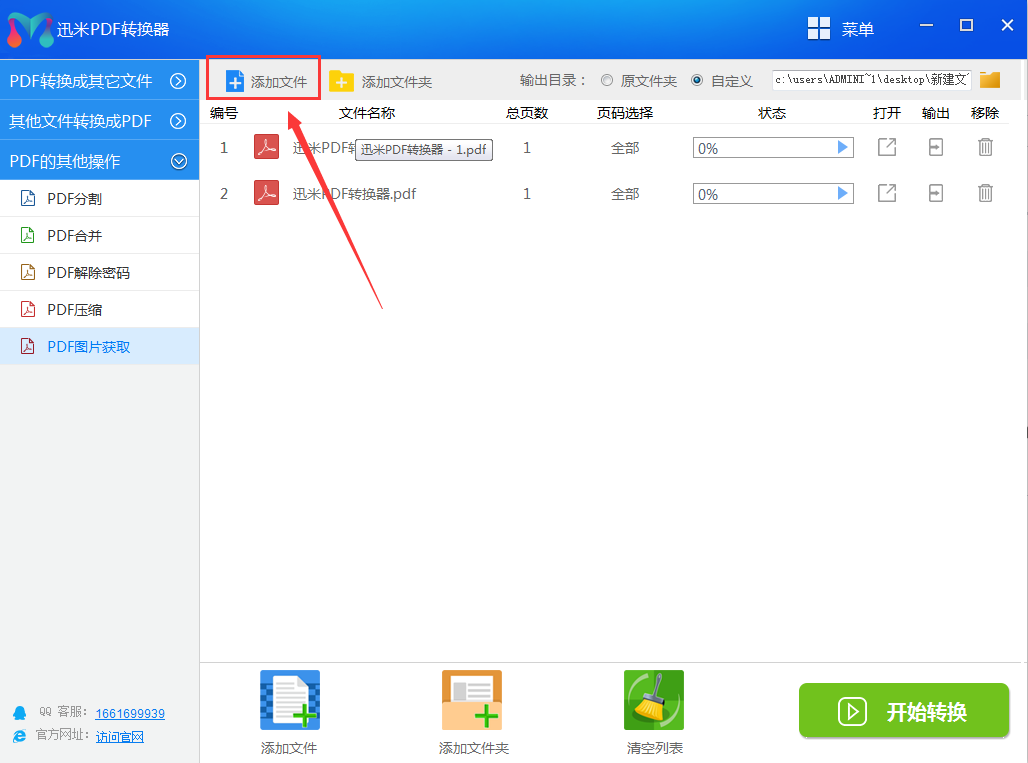 2、将需要提起图片额PDF文件添加到软件中,如下图所示,可以点击“添加文件”进行添加,添加后PDF文件显示在软件右侧。可以同时多个PDF文件同时获取图片,这样更省时间。