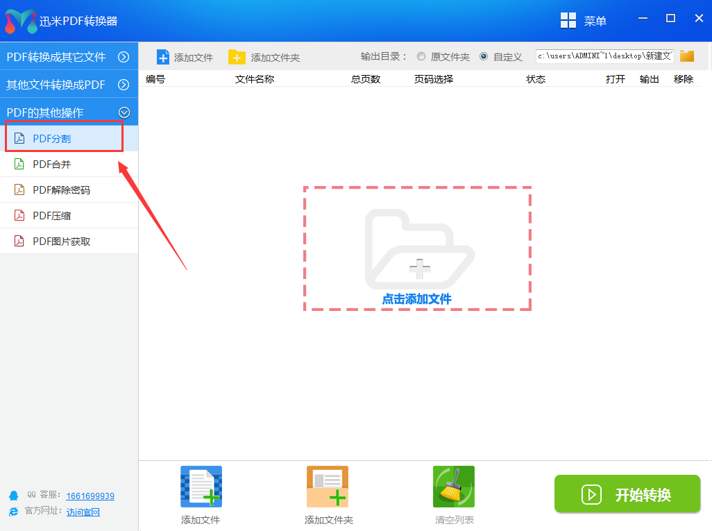 步骤1,安装迅米PDF转换器然后打开,在软件界面左侧列表中点击【PDF的其他操作-PDF分割】功能。