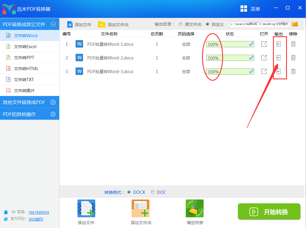步骤4,当软件中列表右侧的每个文件转换进度条都变成100%的时候,说明PDF批量转换Word全部成功,点击“输出按钮”就能查看这些word文件了。