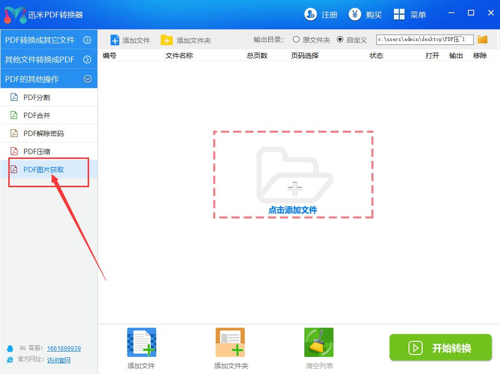 步骤1,打开迅米PDF转换器,在软件左侧找到“PDF的其他操作”列表下的【PDF图片获取】功能并点击,进行下一步的提取操作。
