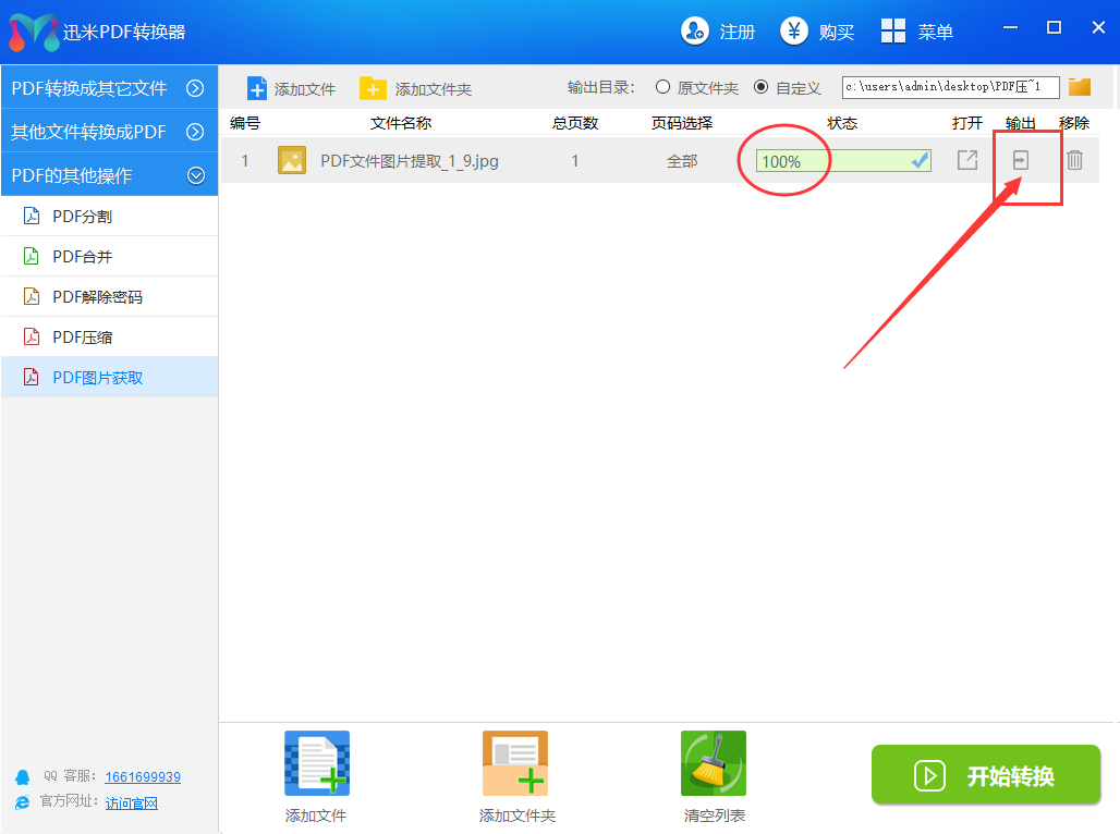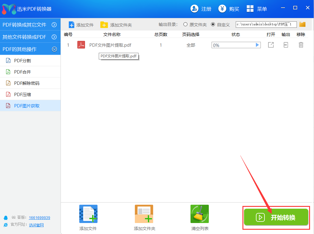 步骤3,点击“开始转换”绿色按钮,软件则开始帮你从PDF文件中提取图片了,你只需要等待。