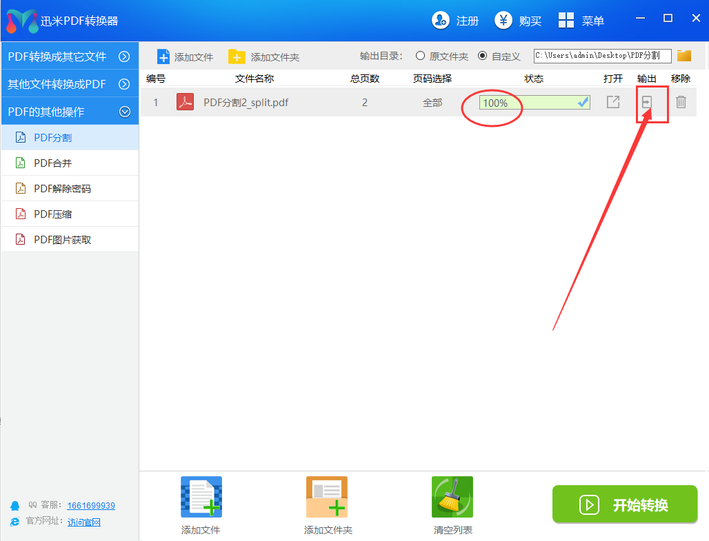 步骤4,如下图所示,当状态下面的进度条变成100%的时候说明PDF被成功拆分,点击右边的“输出”图标按钮,就可以打开拆分后pdf文件所在的文件夹了。
