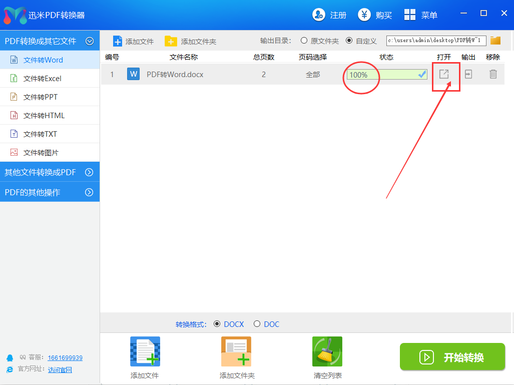 第4步,软件状态栏下面显示的是转换进度条,当转换进度条变成100%的绿色时,说明转换成功了。这是如果你想打开转换成的Word文件,你只需要点击右边的“打开”按钮即可。