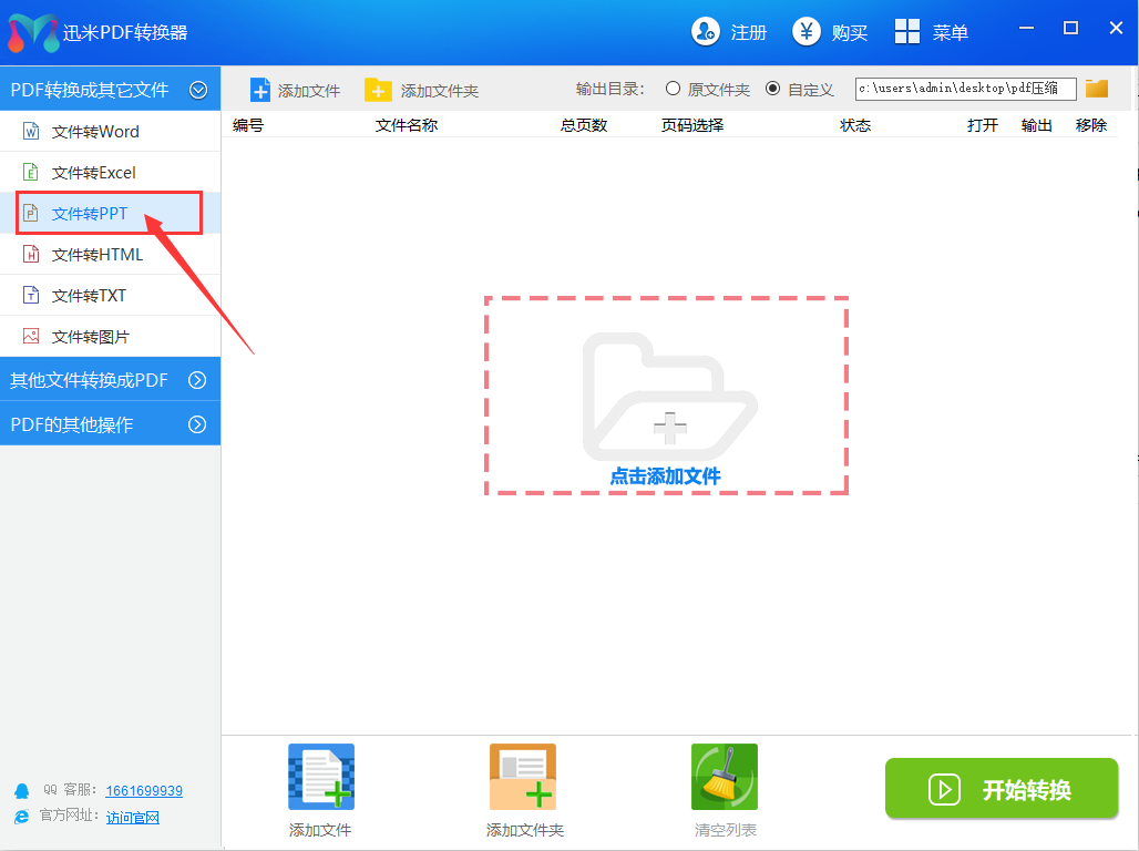 步骤1,打开迅米PDF转换器,软件左侧为功能列表区,找到功能【文件转ppt】,点击然后进入下一步,从这里进行pdf转ppt操作。