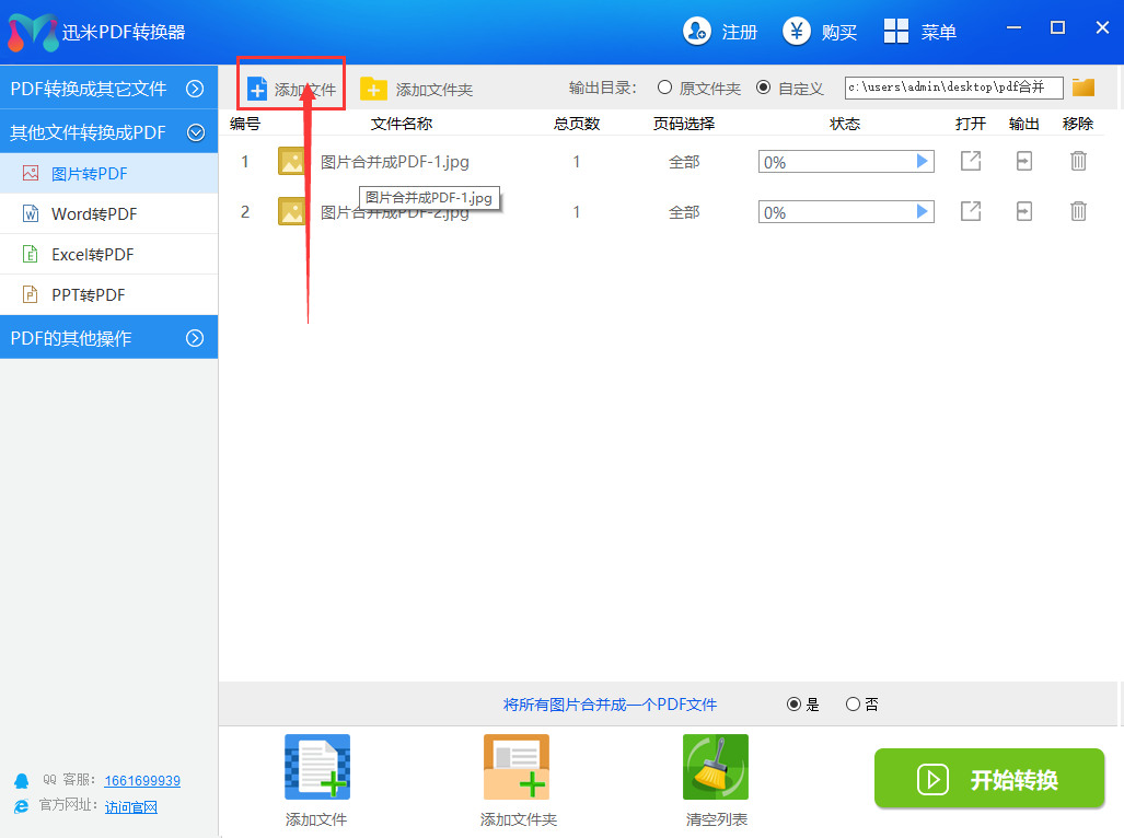 第2步,如下图所示点击红框内的“添加文件”,将需要合并转换的图片全部添加到软件中,添加成功后图片名称会显示在软件右侧中。