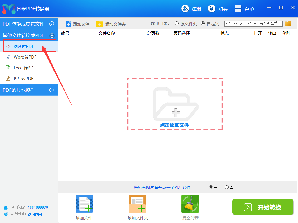 第1步,打开安装好的迅米PDF转换器,在左边功能列表区域找到并点击【其他文件转换成PDF】-【图片转PDF】功能,然后进入下一步操作。