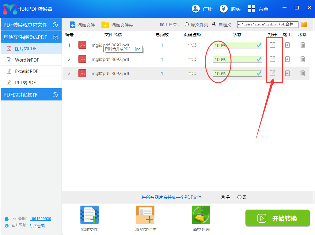 第4步,当软件中的转换进度条变成绿色的100%状态时,说明这些图片文件整个的合并转换成了一个PDF文件,这时候只需要点击“打开”图标按钮,就可以查看合并好的PDF文件了。