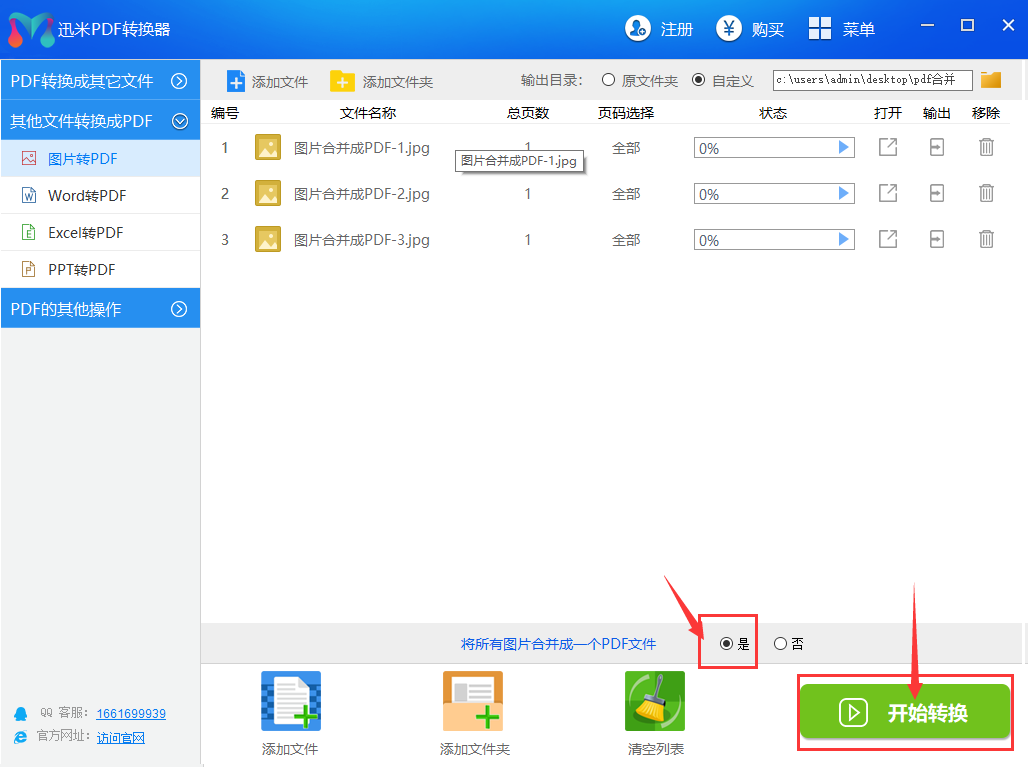 第3步,“将所有图片合并成一个PDF文件”的单选框选择“是”。然后点击右下角位置的“开始转换”按钮,这样软件就开启了合并转换程序,我们稍等片刻,等待软件操作成功。