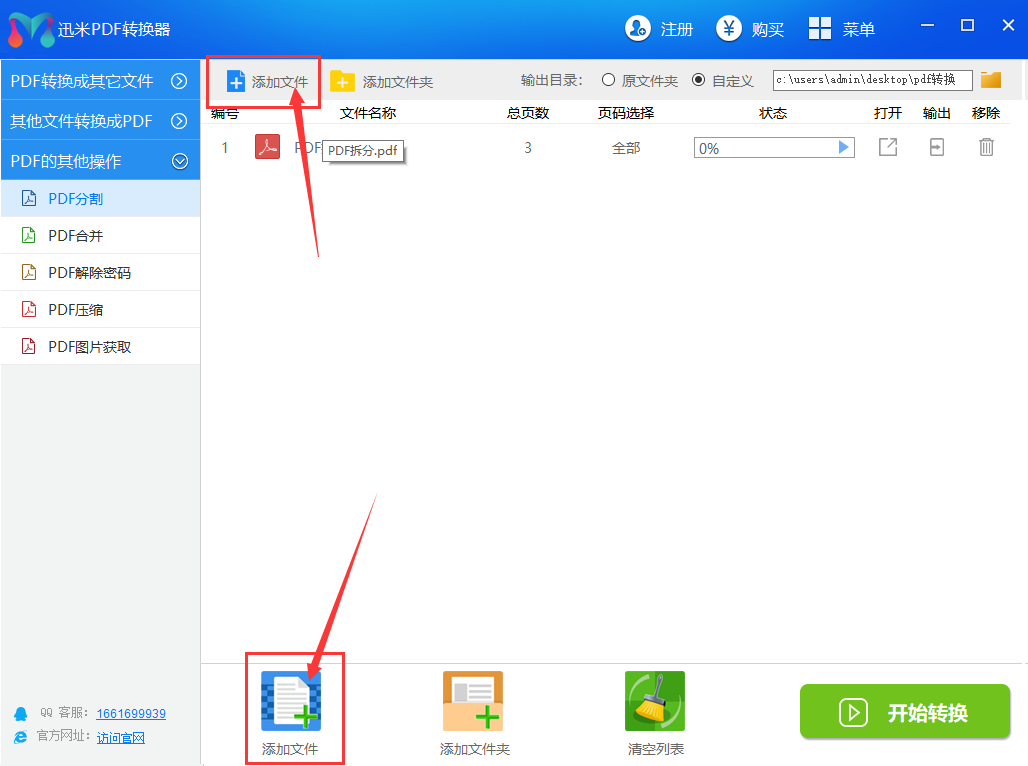 步骤2,如下图所示点击任意一个【添加文件】按钮,将需要拆分的PDF文件添加到软件中,注意软件支持批量拆分,所以可以一次性添加多个文件。