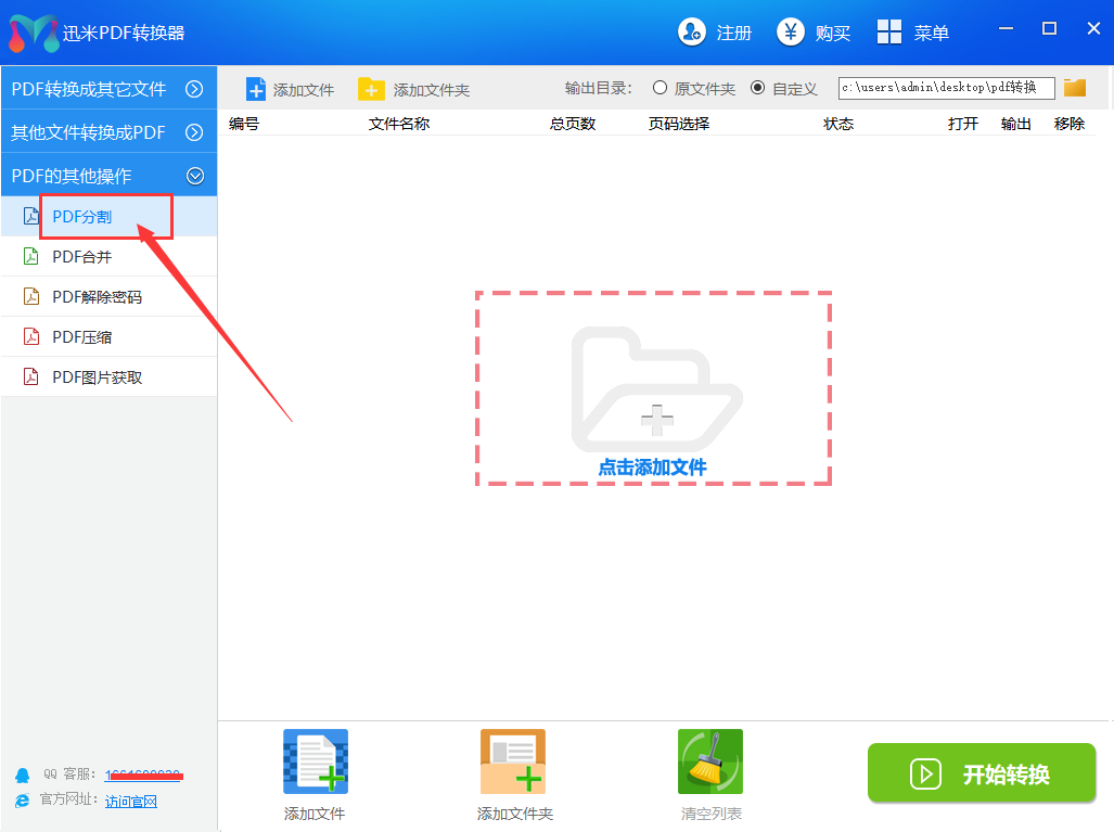 步骤1,下载迅米PDF转换器软件后安装打开,在软件左边的功能区域中依次找到并点击【PDF的其他操作】-【PDF分割】功能,从这里进行PDF文件的拆分操作。