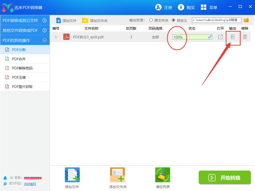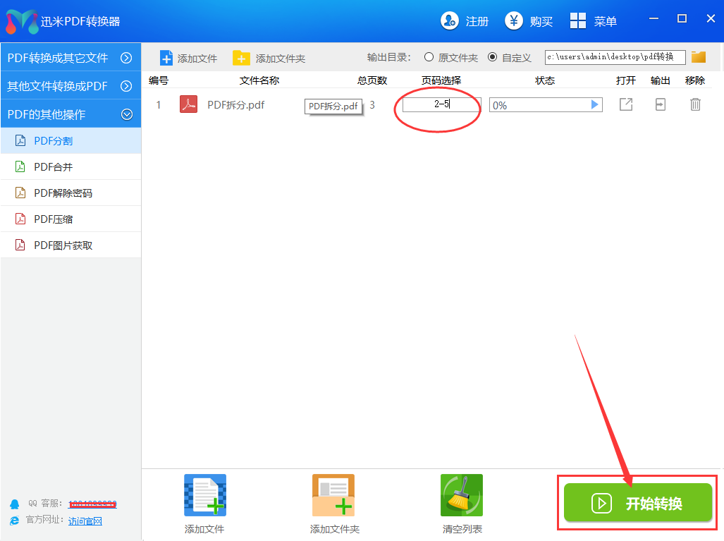 步骤3,设置拆分的页面,如果你想拆分第2页到第5页,就写入2-5,如果全部拆分就不需要设置。然后点击右下角位置的【开始转换】按钮,这样软件就启动拆分程序了。