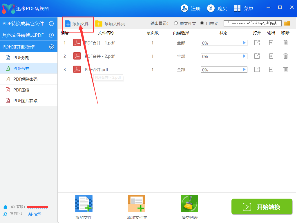 步骤1,打开安装好的迅米PDF转换器软件,找到并点击左边功能别表中的【PDF的其他操作-PDF合并】功能。
