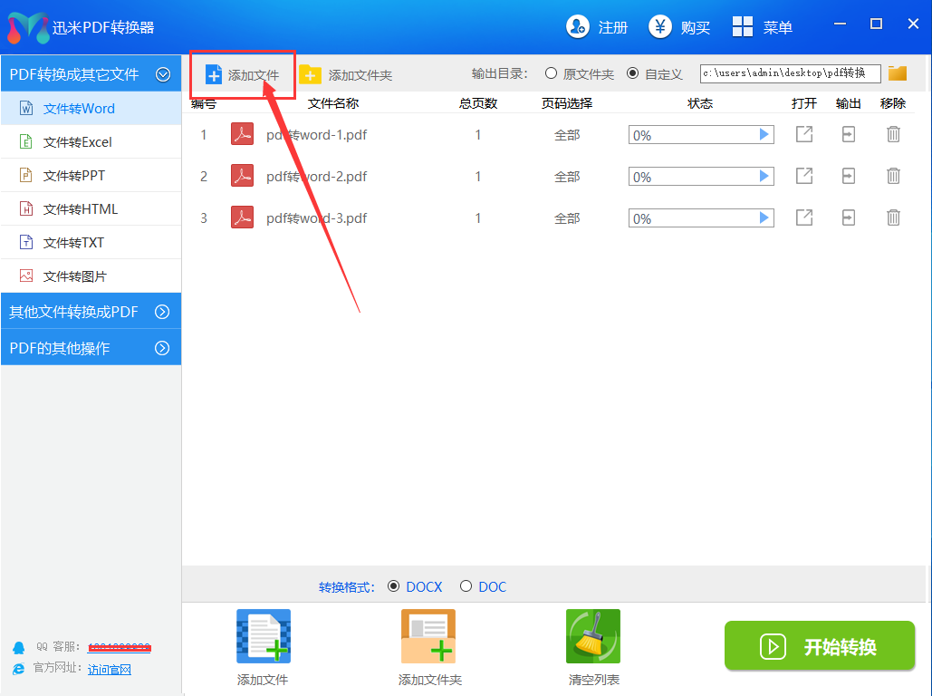 步骤3,软件右上方设置转换后word文件的保存路径,再设置word文件的输出格式doc或者docx,如果没有别的设置了就点击【开始转换】按钮,启动程序。