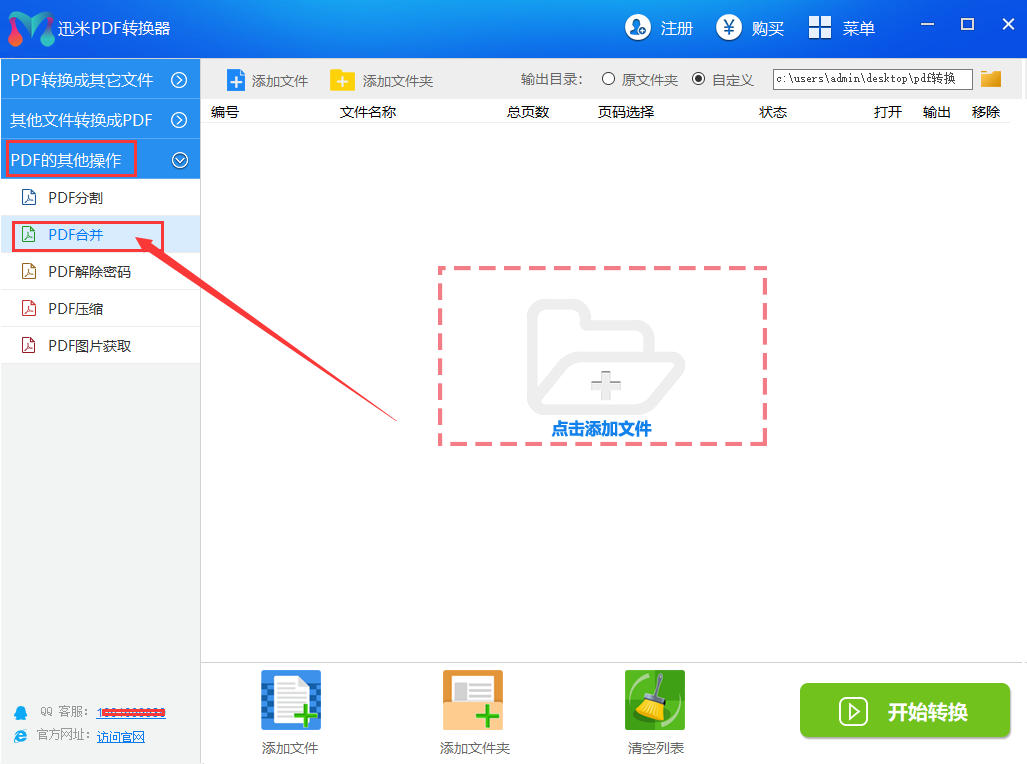 步骤1,下载安装迅米PDF转换器后打开,点击【PDF其它操作】功能,在左侧的功能区域中我们可以看到“PDF合并”功能,点击进入下一步。