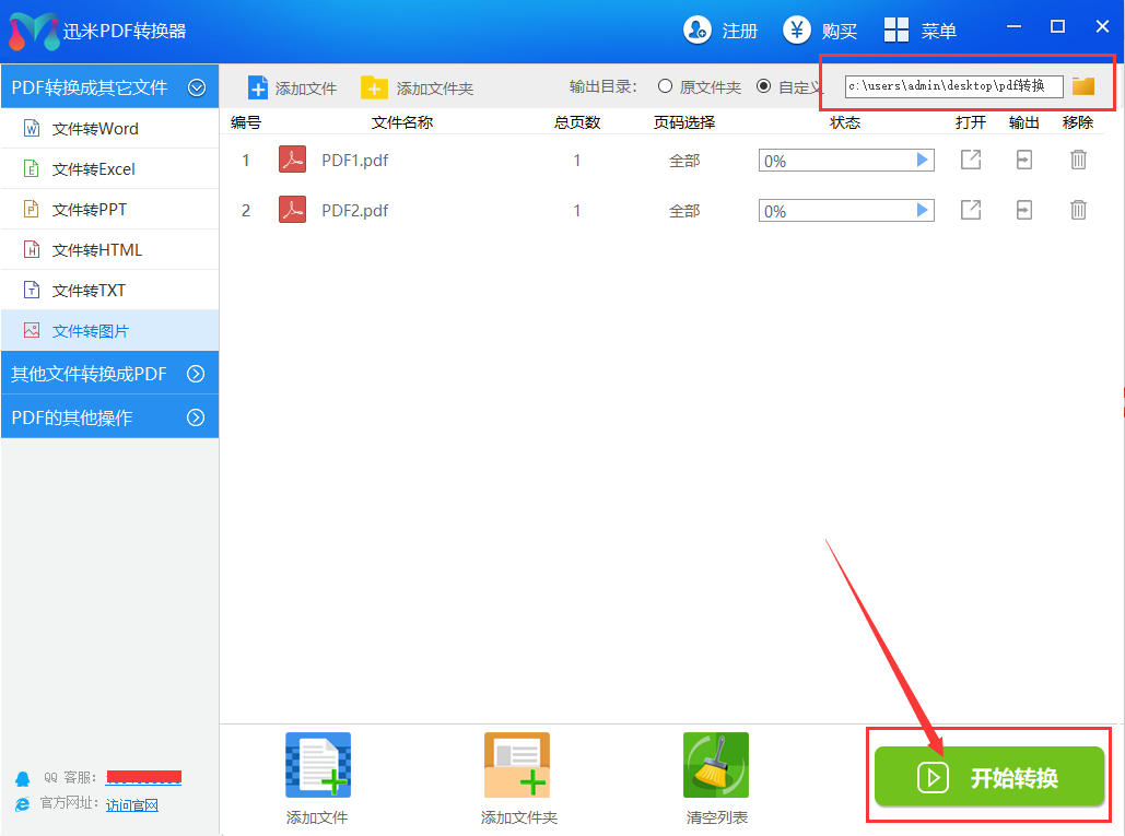 3:添加文件后,设置输出目录,在确认好没有其它设置需求的前提下,点击“开始转换”按钮即可完成PDF转换成清晰的图片啦!