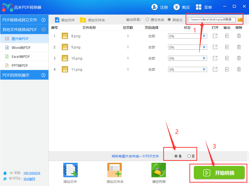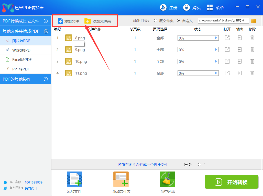 步骤:3:文件添加完成之后,可以在【输出目录】设置文件的保存路径,并点击软件右下角“开始转换”即可实现图片批量转换成PDF了。需要另外说明的是,软件内核极速处理,等待数秒立马完成,转换的过程实时可以暂停。在这儿我们还可以选择需要转换多少页到多少页。或者我们还可以选择是否将图片合并成一个PDF文件还是多个PDF单独保存。