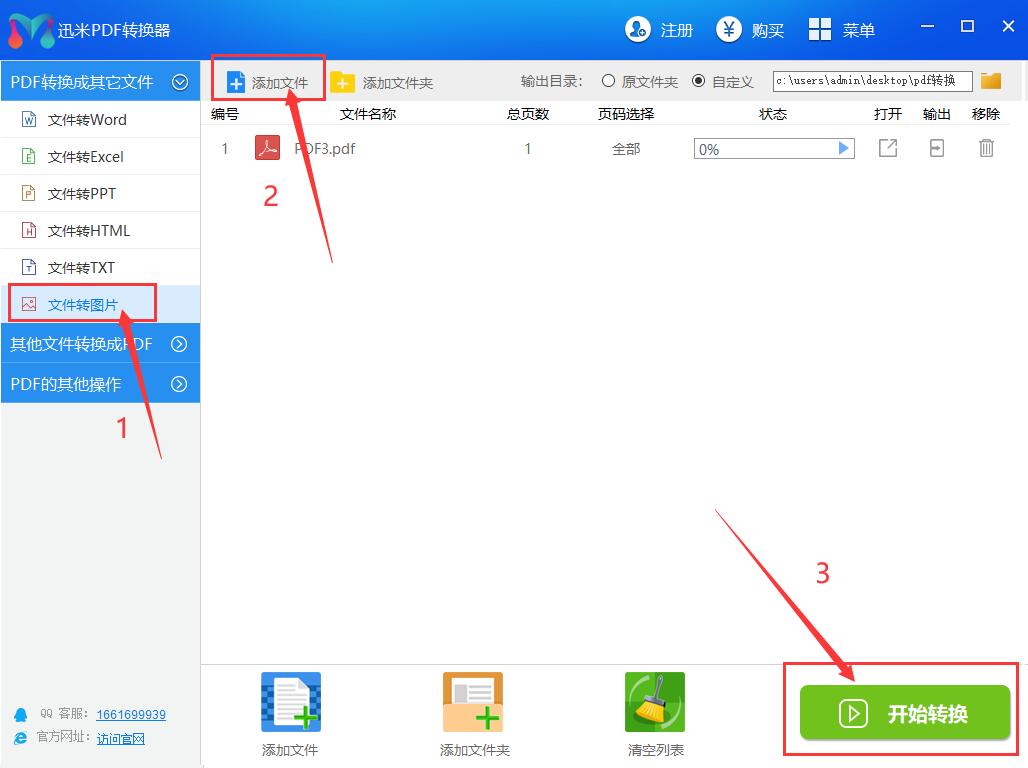 下载迅米PDF转换器软件包,双击安装完成之后双击打开。首先,我们需要做的是选择转换功能选项,也就是选择“PDF转换成其它文件”中的“PDF转图片”选项。然后,点击中间空白区域的【添加文件】或者将需要转换的PDF文件拖拽到中间的转换框里,或者点击“添加文件”或者“添加文件夹”来实现批量添加,添加文件后,设置好输出目录。最后,在确认好没有其它设置需求的前提下,点击“开始转换”按钮即可完成PDF转换成图片啦!