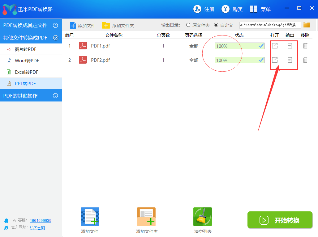 步骤4,当所有文件名称右边的进度条变成100%的时候,说明ppt成功的转成了pdf。点击右边的“打开”或“输出”图标,就能查看转换成的pdf文件了。