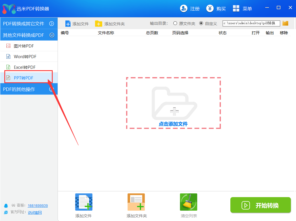 步骤1,下载迅米PDF转换器后双击安装并打开,点击左边列表中的“PPT转PDF”功能,进入下一步操作。