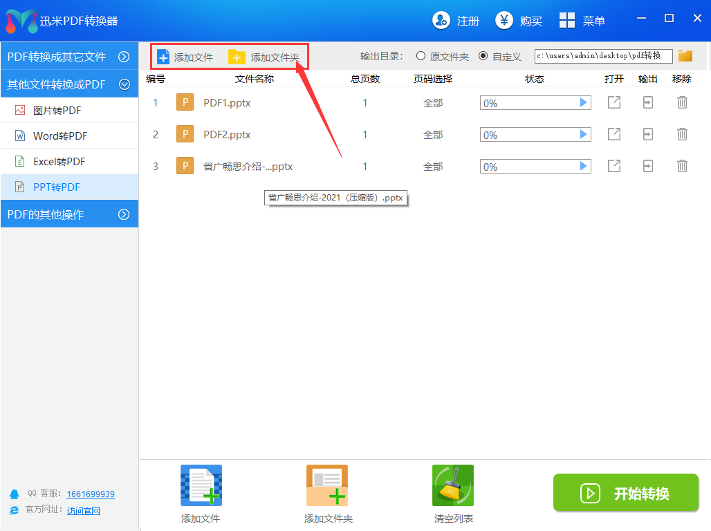 步骤2,点击【添加文件】或【添加文件夹】按钮,将ppt文件全部导入到软件中。