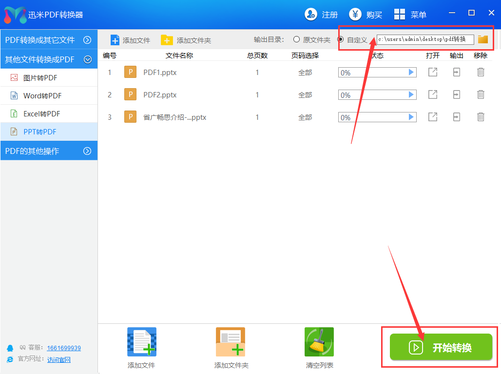 步骤3,设置输出目录,确定转换后pdf文件的保存位置,然后点击【开始转换】绿色按钮,启动软件格式转换程序。