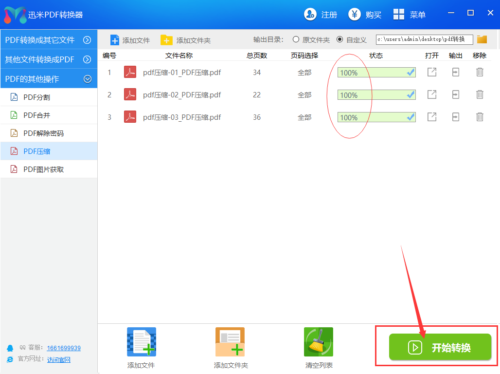 步骤3,在没有其它设置需求的前提下,点击右下角的“开始转换”按钮,软件就开启压缩变小操作了,我们只需要等待即可。当软件中状态栏下方的压缩进度条变成100%的时候,说明较大的PDF文件被成功的压缩变小了,点击右边的输出图标就可以查看压缩后的PDF文件了