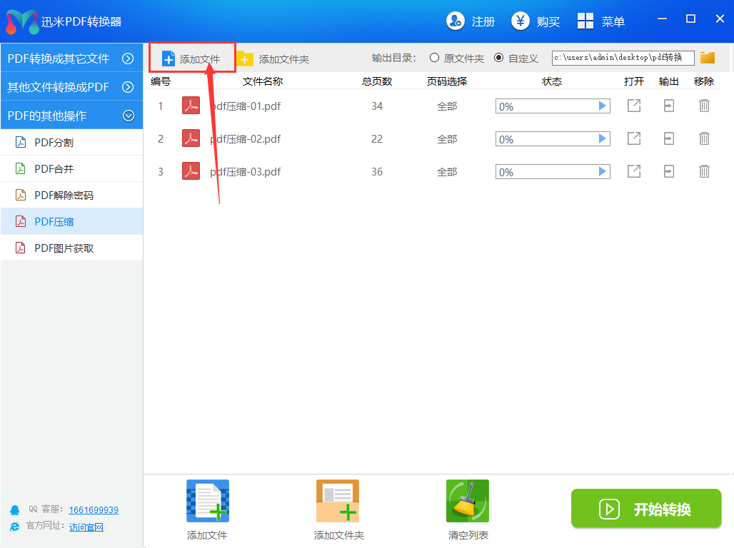 步骤2,,点击“添加文件”按钮,将需要变小的PDF文件添加到软件中,添加成功后文件名称显示在软件中。软件支持多个文件批量压缩变小,所以我们可以同时批量添加多个PDF文件到软件中,这样更节省时间。