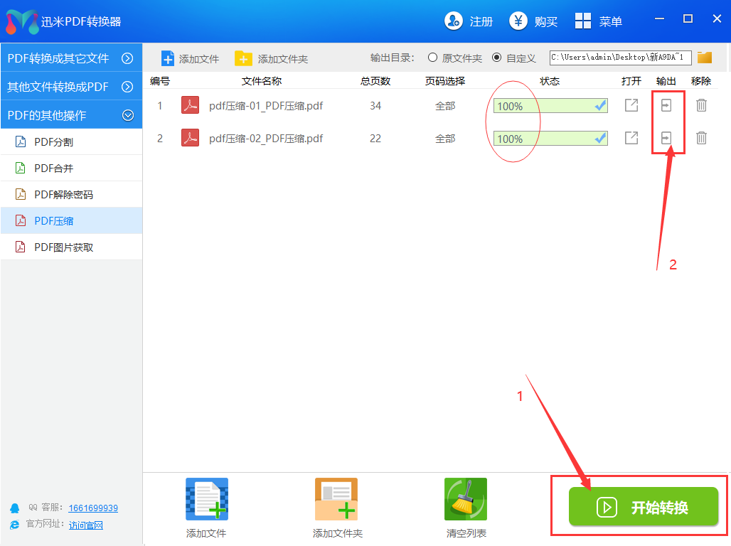 然后,点击右下角【开始转换】按钮,启动压缩程序,当状态栏变成100%的绿色时说明文件压缩完成。点击右边的“输出”图标按钮即可打开输出文件夹,查看压缩后的pdf文件。