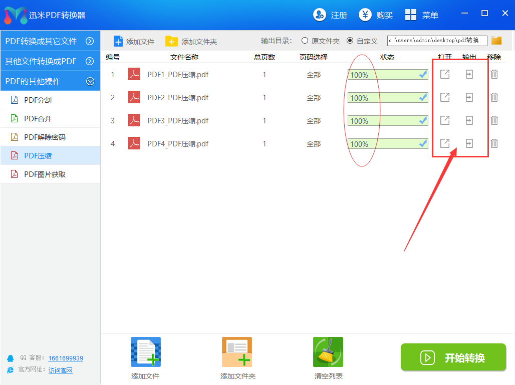第四,然后点击右下角的【开始转换】绿色按键,启动压缩,当进度条变成100%的时候,说要pdf文件压缩成功。