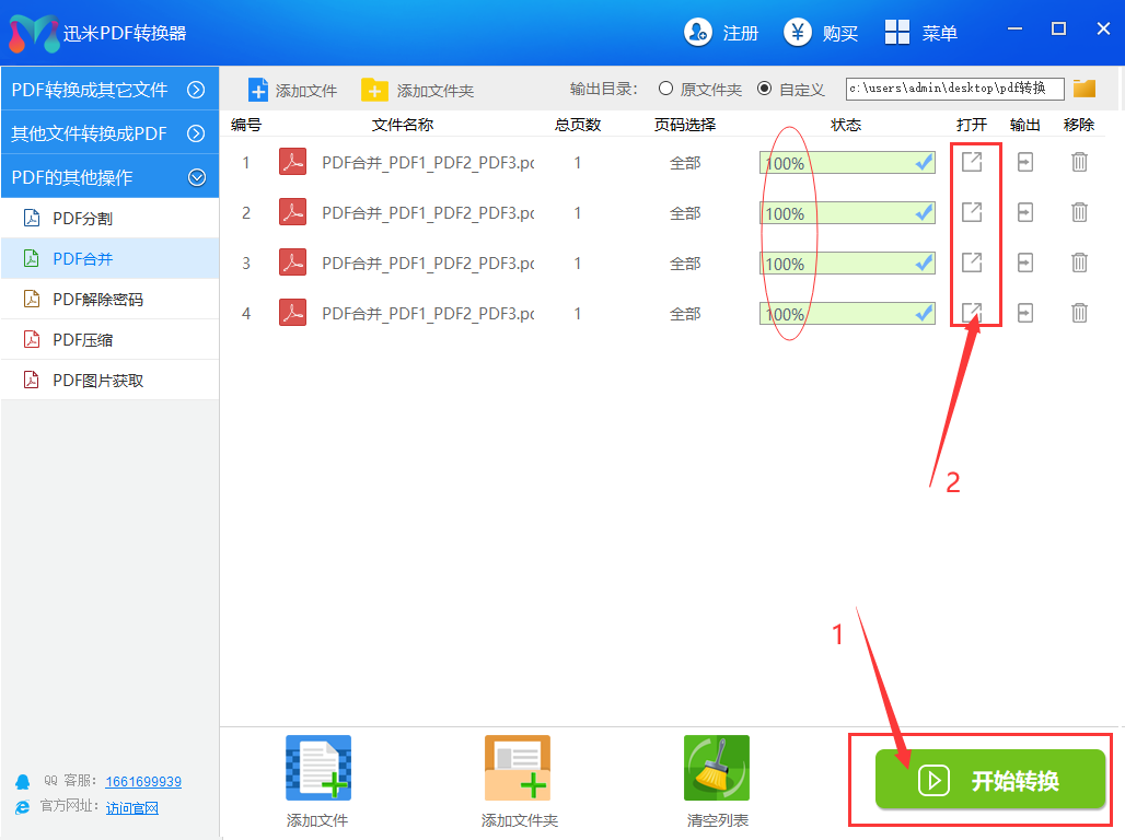 步骤3,点击右下角的【开始转换】绿色按键启动软件程序,当所有pdf文件右边的进度条变成100%的时候,说明合并完成,点击右边的“打开”图标按钮,即可查看合并后的pdf文件了。