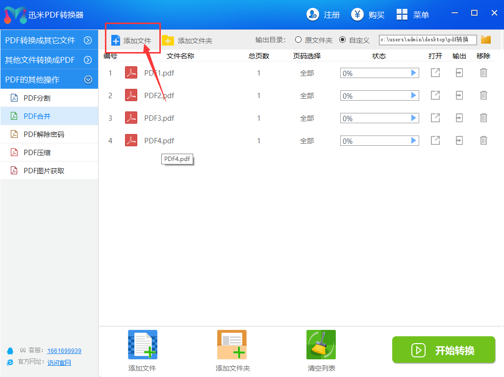 步骤2,点击【添加文件】按键,将需要合并的PDF文件导入到软件中。