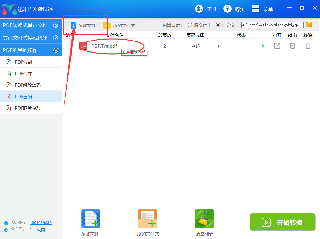 第1步:打开安装好的迅米PDF转换器,软件主界面的左边列表为所有功能列表,我们依次找到并点击【PDF的其他操作】-【PDF压缩】功能,然后进行下一步操作。