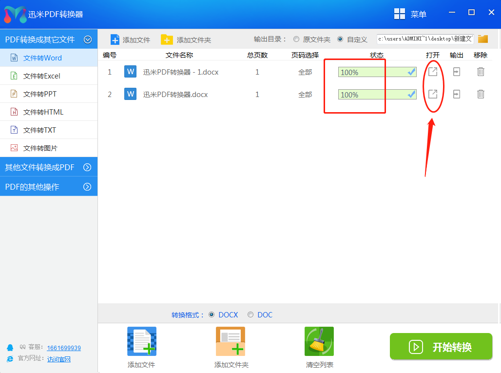 步骤4:当每个文件右侧的转换进度条到达100%时,说明软件成功的将PDF文件转换成了Word文件,我们点击右边的“打开”图标按钮,就能打开转换好的Word文件啦。